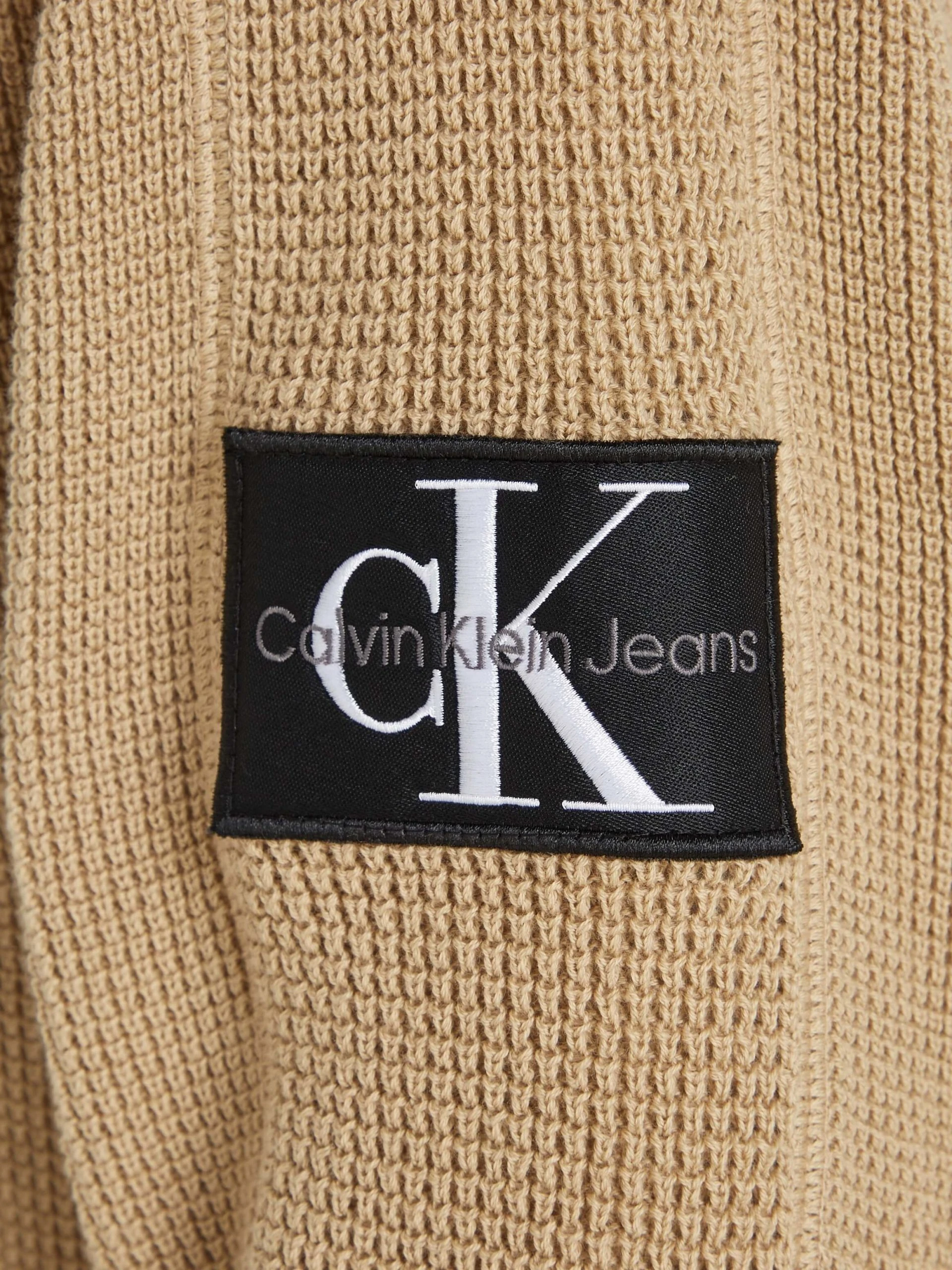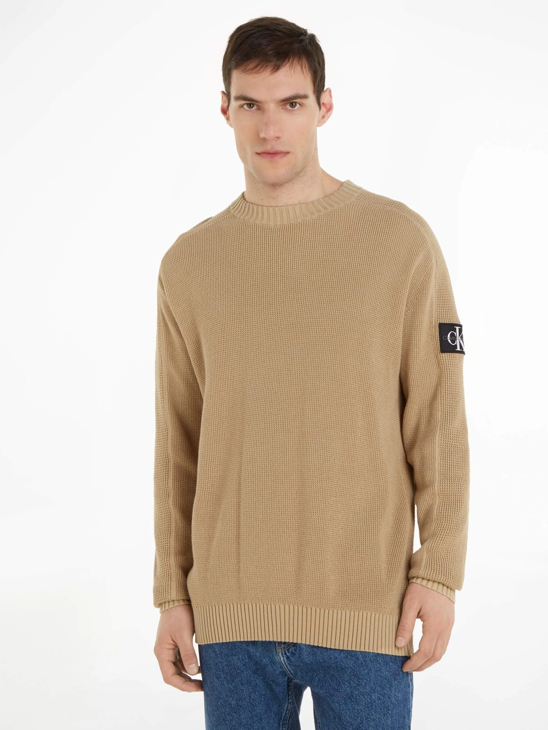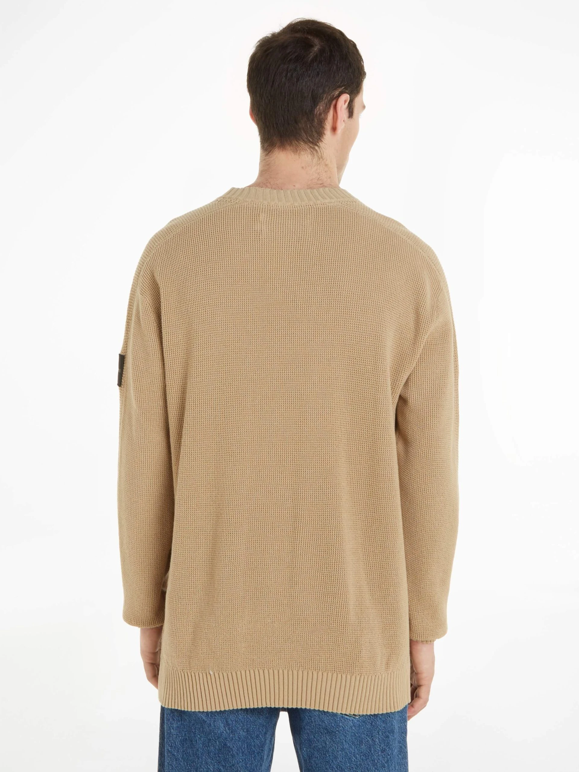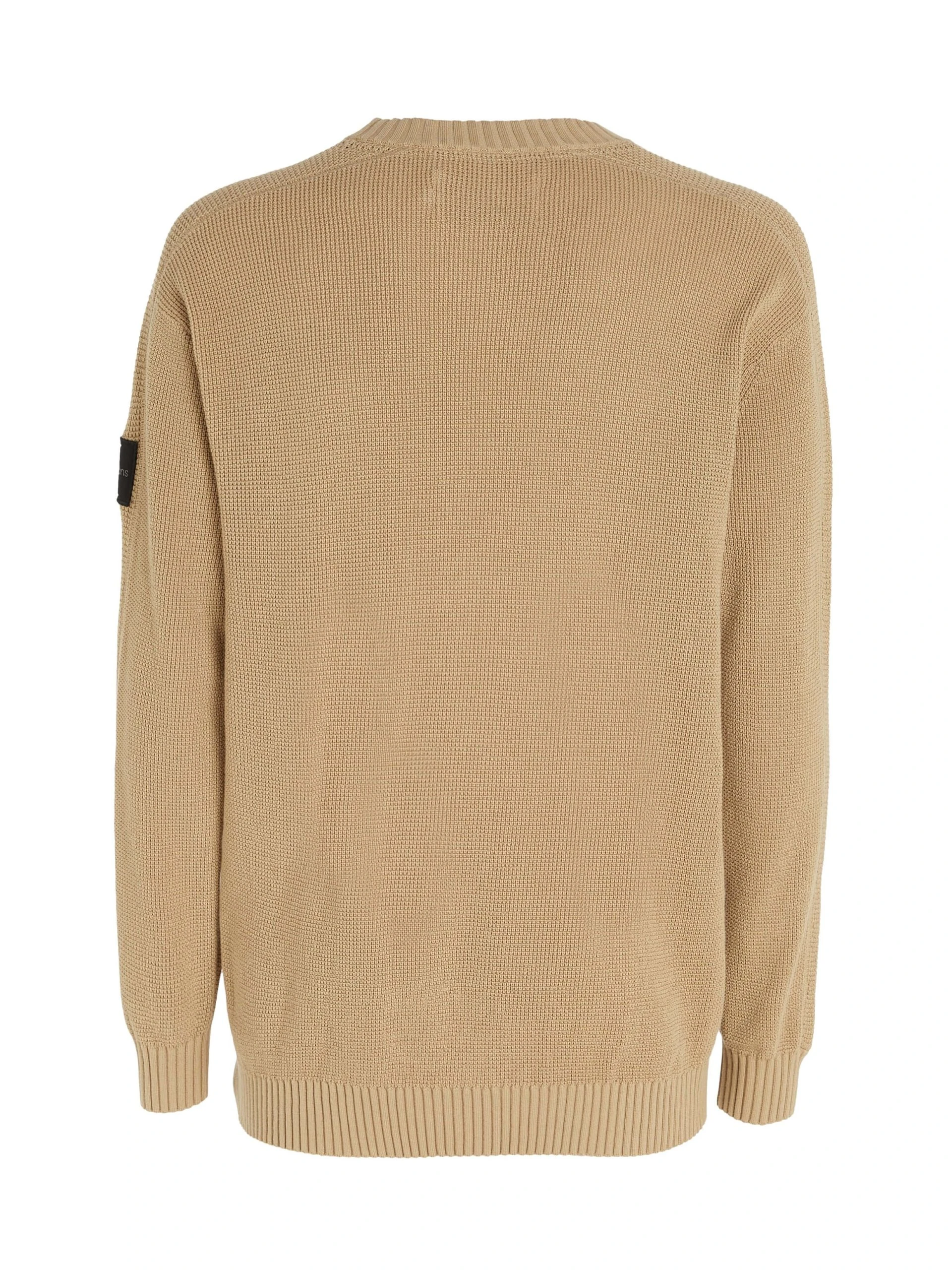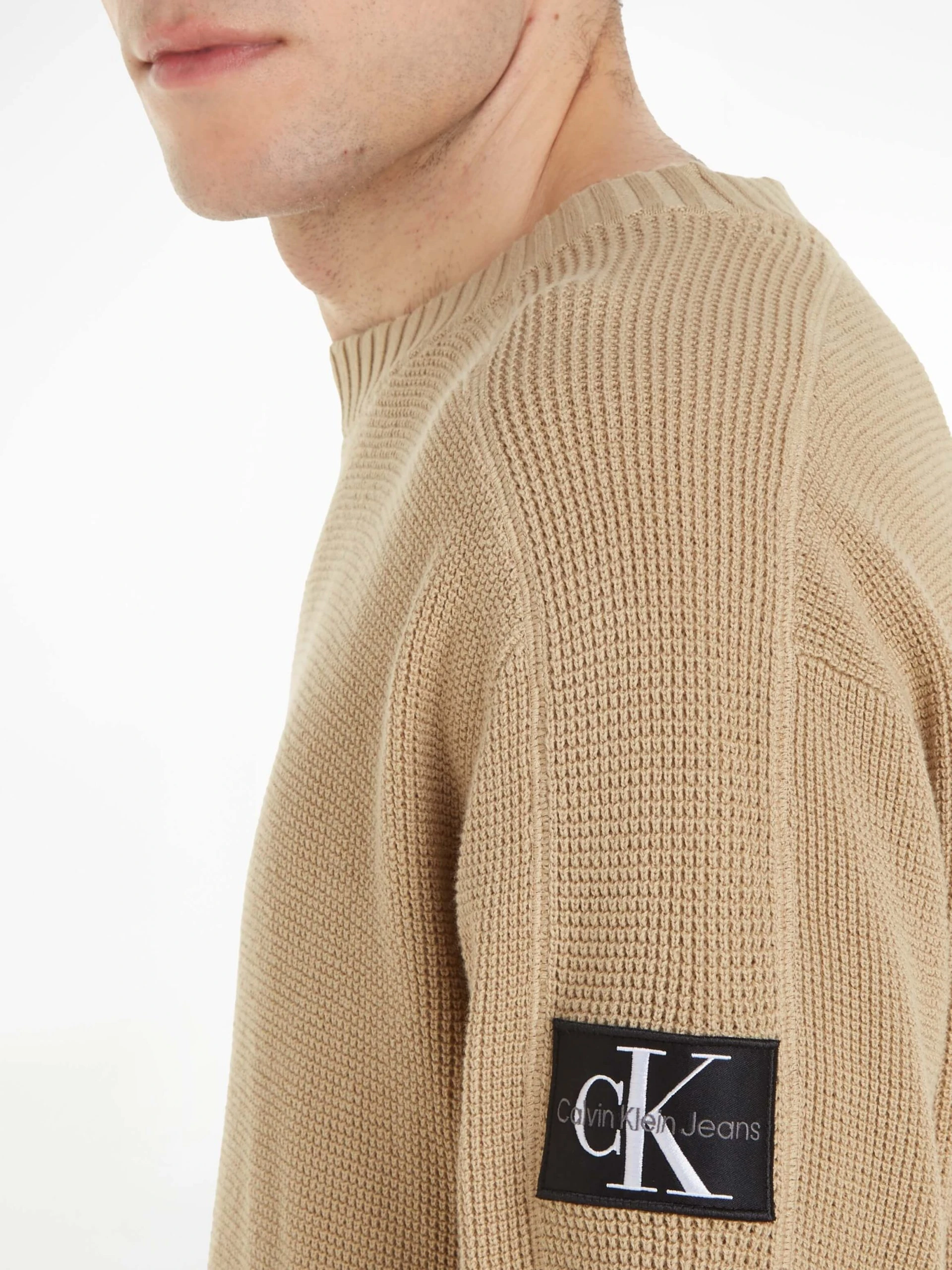 Calvin Klein Badge Waffle miesten neulepusero luomupuuvillalangasta vohvelikuviolla, jossa sävy-sävy-kankainen logoetiketti
