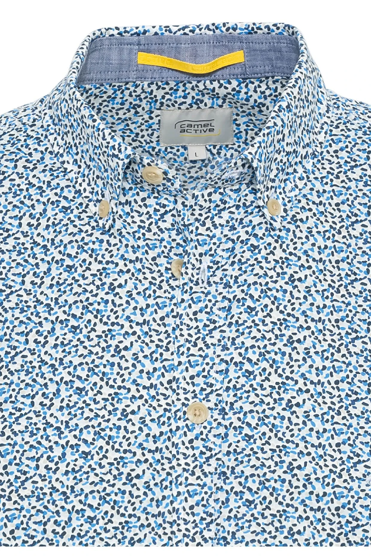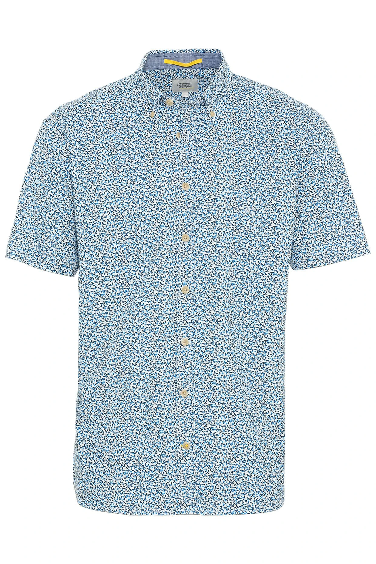 Camel Activen laadukas puuvillasta valmistettu lyhythihainen kauluspaita, jossa tyylikäs kuviointi. Normaali istuvuus, nappikaulukset ja napitus edessä. Pieni logo rinnassa.