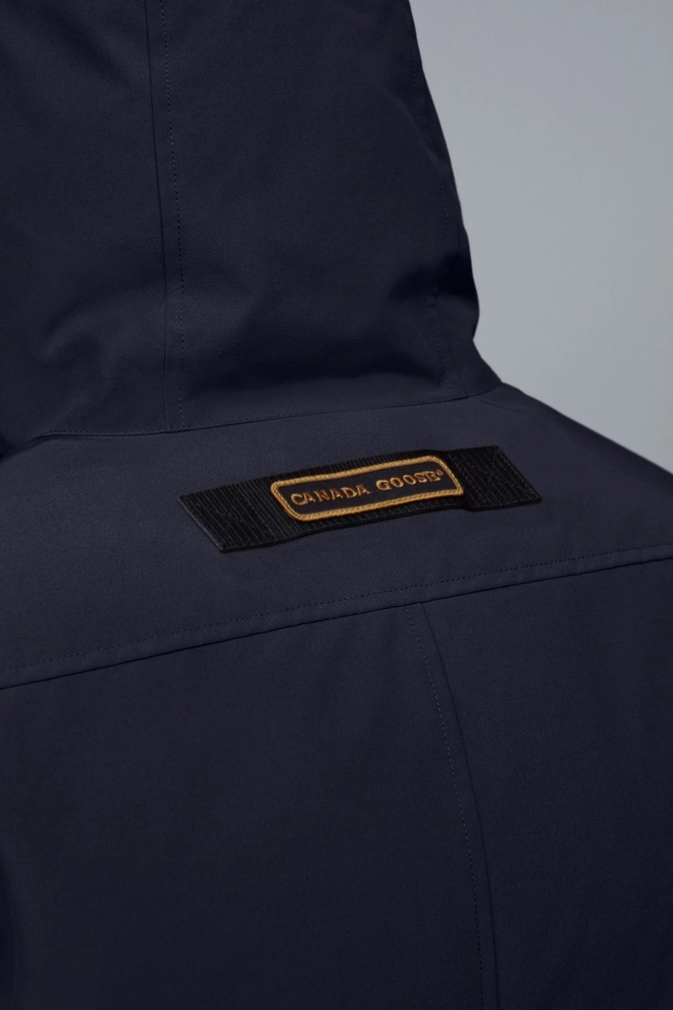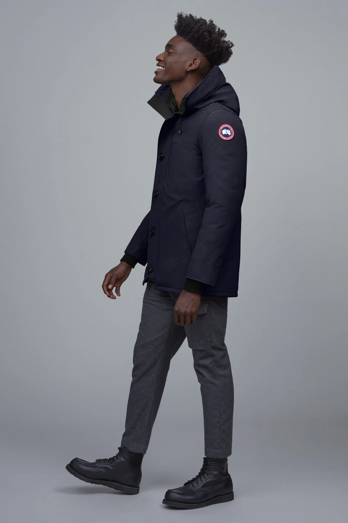 Canada Goose miesten parkatakki Chateau Parka on suunniteltu kylmiin olosuhteisiin, malliltaan klassinen ja ilman turkista. Tuulen ja kosteuden kestävä kangas, lämmin untuvatäyte. Reiden puoliväliin oleva takki on kapea (slim fit) silhuetiltaan ja sopii hienosti kaupunki- ja työmatkakäyttöön. Edessä kaksisuuntainen vetoketju ja napit, hihansuiden sisäpuolella lämmittävät resorit. Suojaava, reilunkokoinen huppu. Yksi rintatasku ja kaksi alataskua, alataskuissa fleecevuori, kaikissa taskuissa vetoketjut. Sisäpuolella yksi vetoketjullinen ja kaksi avointa taskua.