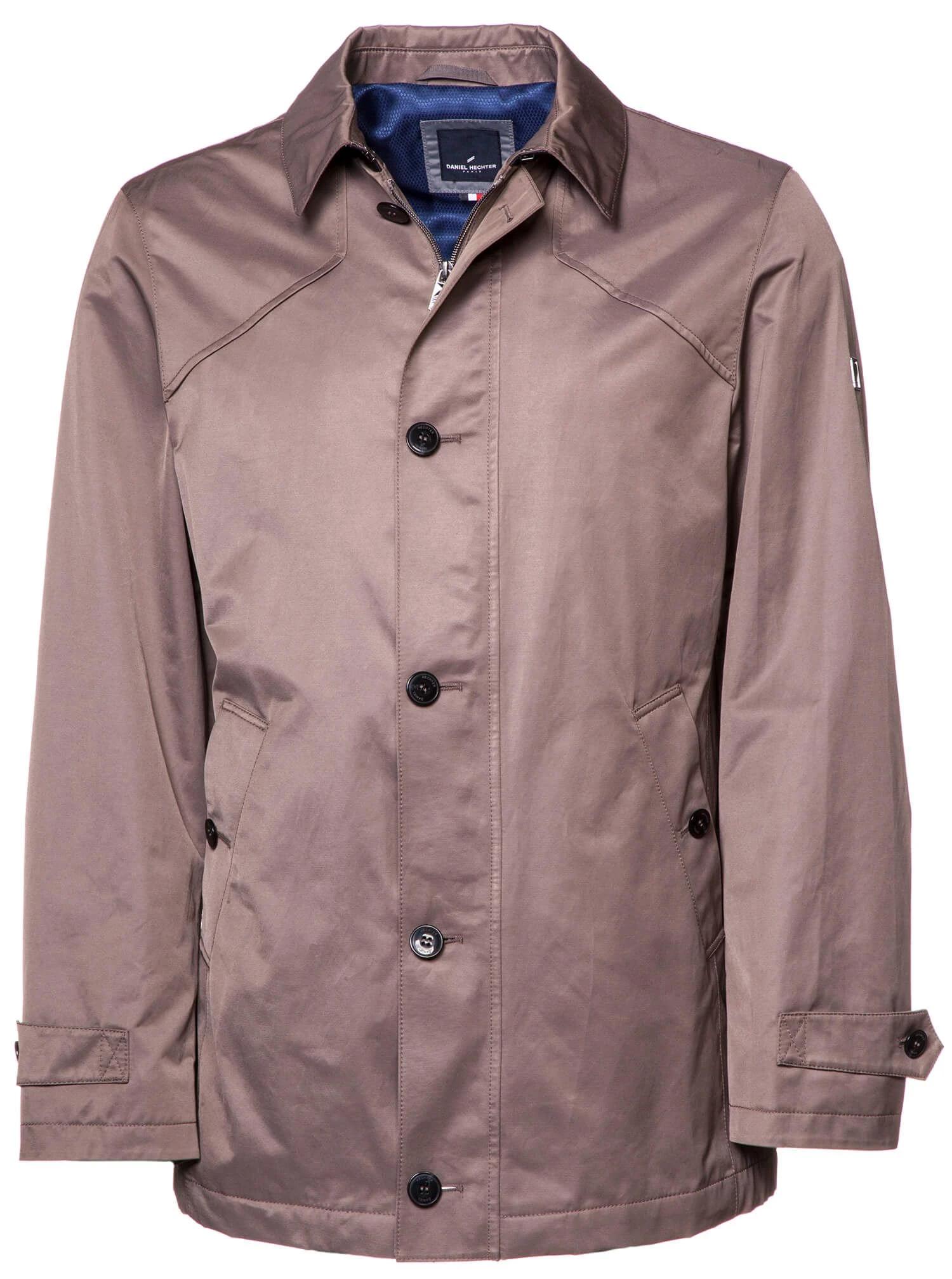 Daniel Hechterin hieman pidempihelmainen ulkoilutakki. Vetoketjukiinnitys ja tuulilistassa napit. Napilliset taskut, vetoketjullinen sekä napillinen povari. Puolivuori, takahalkio