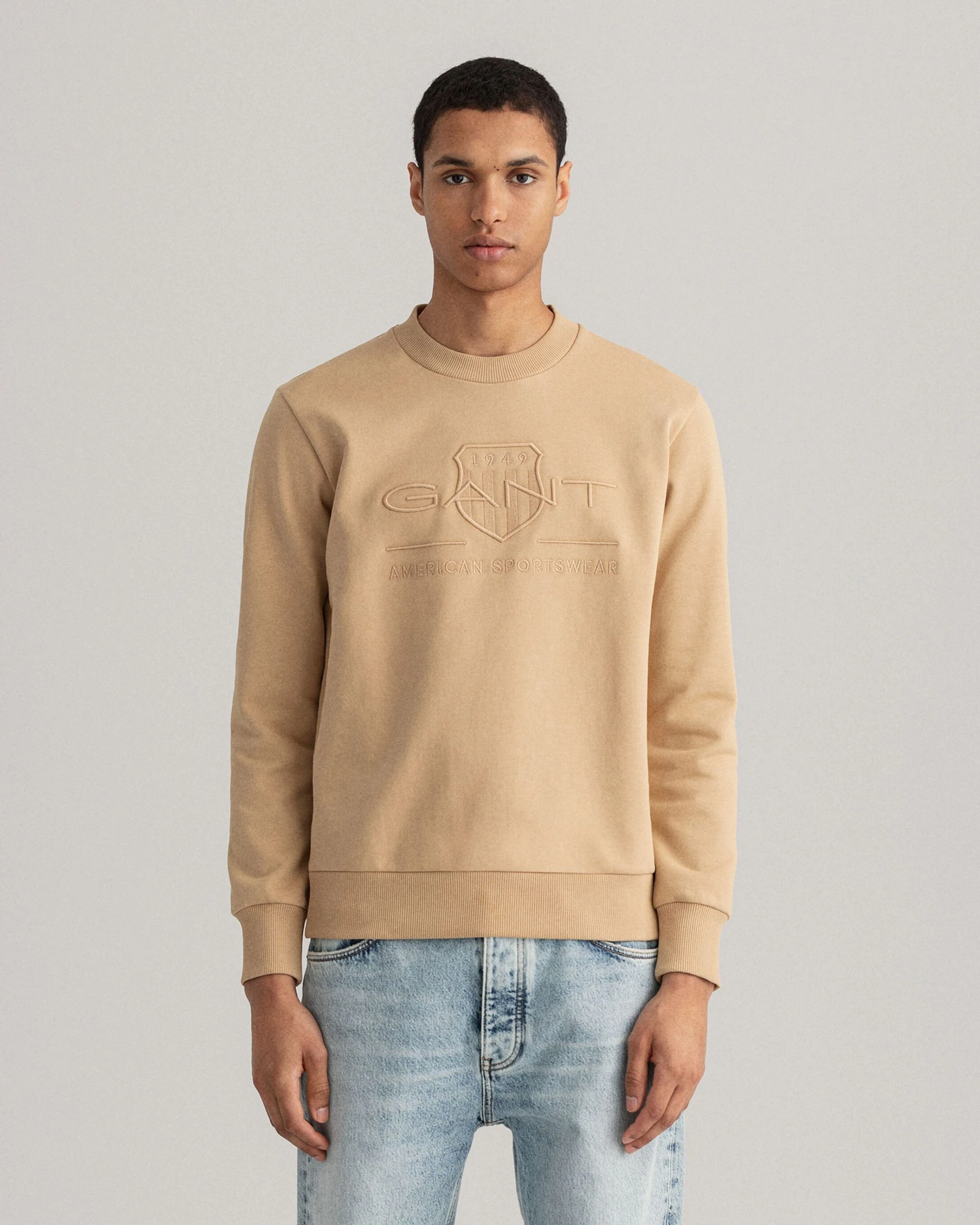Miesten yksivärinen collegepaita, joka on valmistettu puuvillasta. Pyöreä pääntie, normaali istuvuus ja resorit hihansuissa ja helmassa. Kirjailtu logo edessä.
