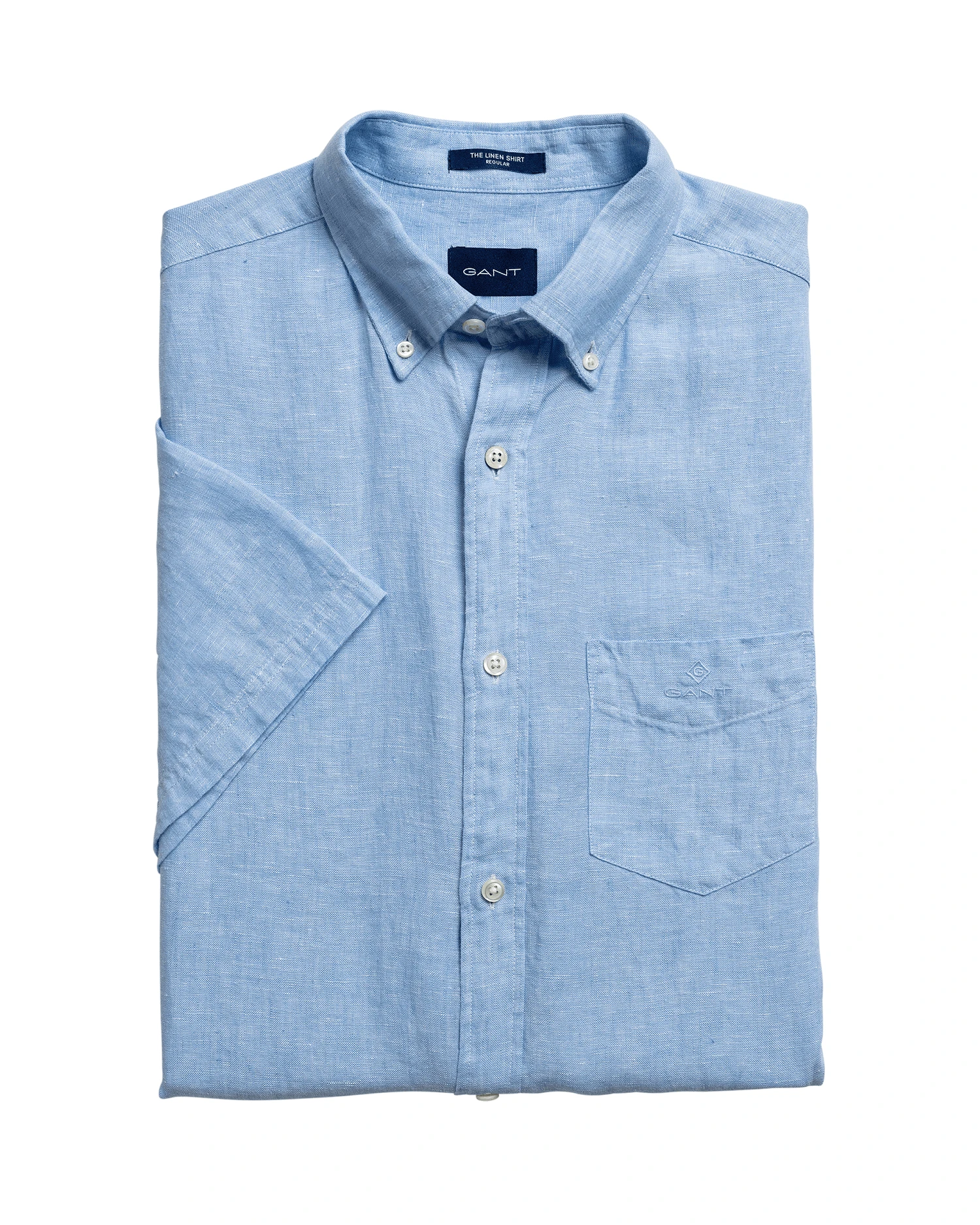 Gantin rento, lyhythihainen pellavapaita. Nappikulmakaulukset, yksi rintatasku ja helma pyöristetty.