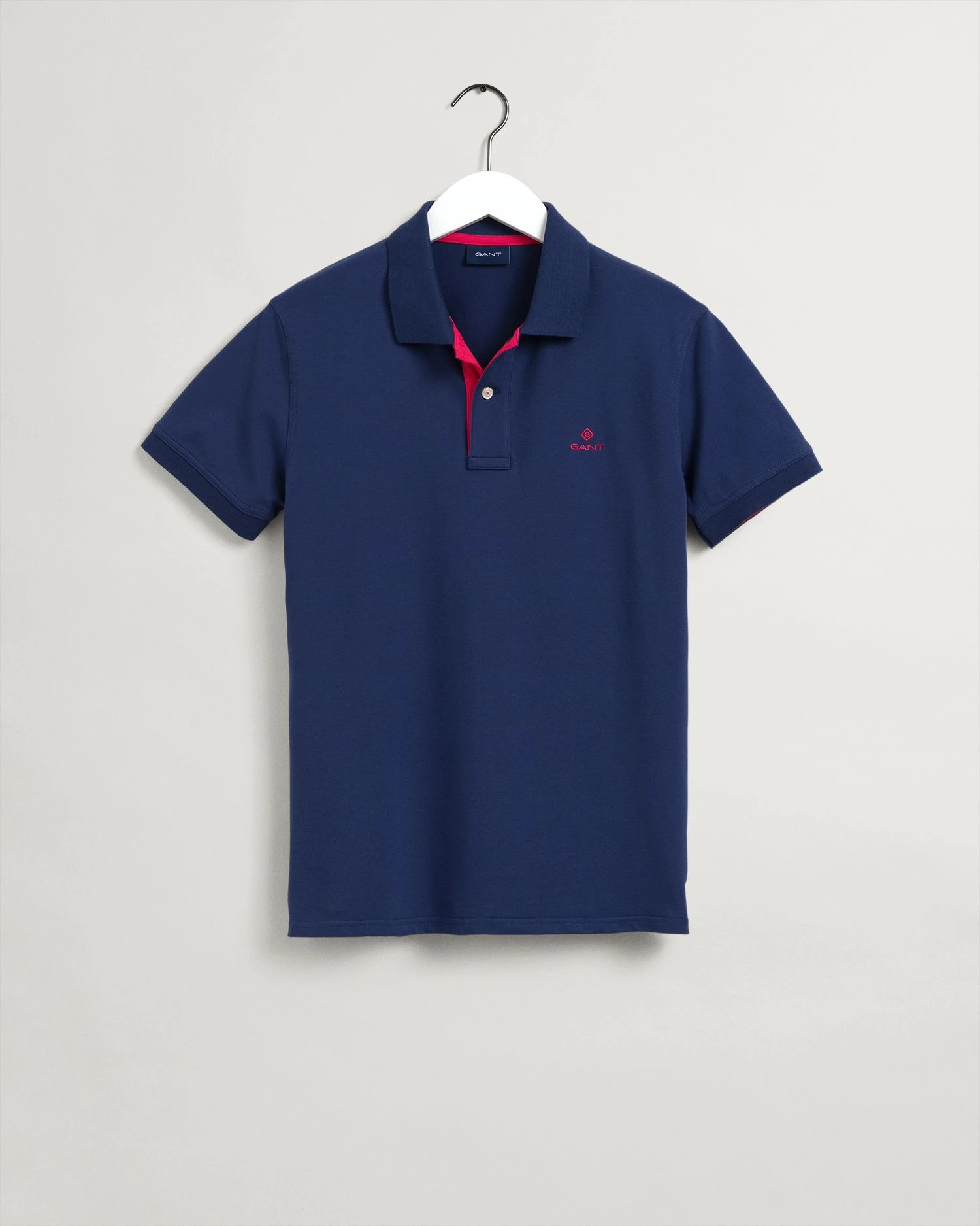 Gant miesten pehmeä, lyhythihainen pikeepaita. Resorikauluksen alapuoli ja nappilistan sisäpuoli erivärinen. Rinnassa brodeerattu logo, helmassa sivuilla lyhyet halkiot.