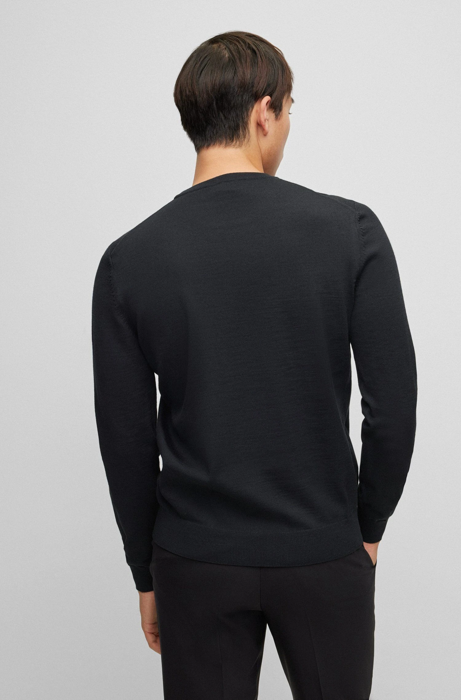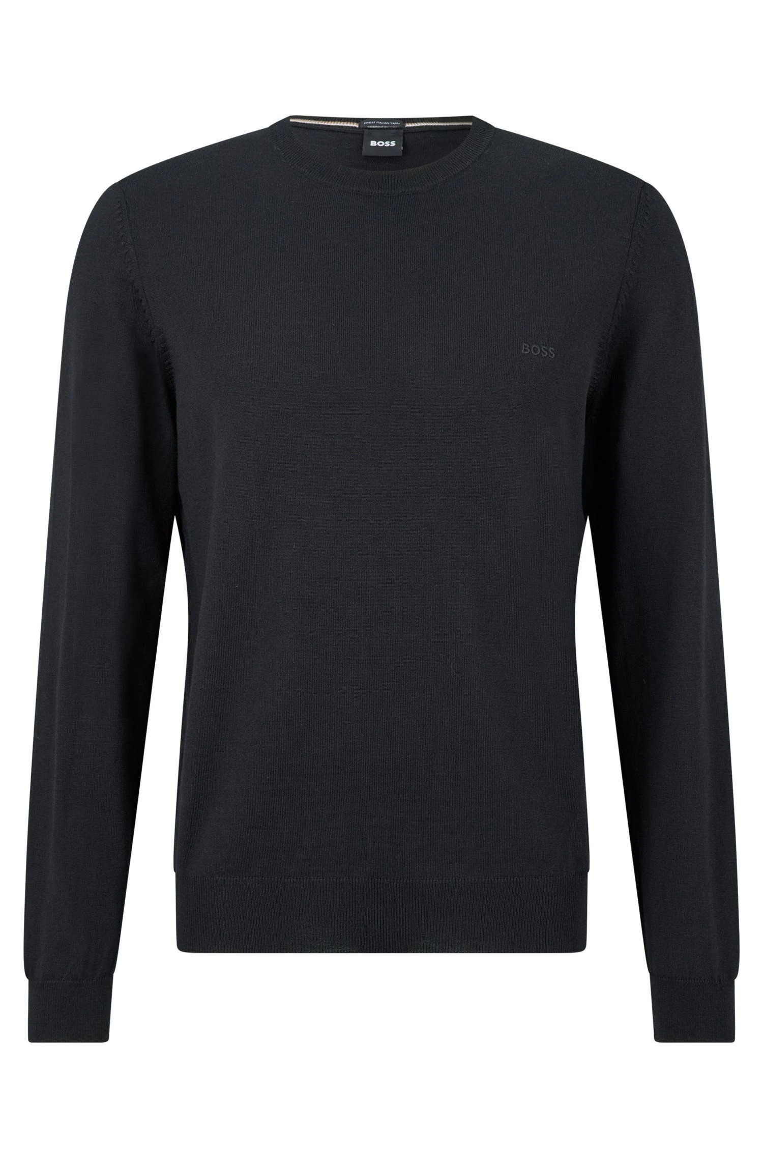Hugo Bossin miesten klassinen neulepaita 100% villaa. Normaali istuvuus, pyöreä pääntie ja pitkät hihat. Pääntiellä, hihansuissa ja helmassa joustinneulosta. Rinnassa hillitty brändin logo.