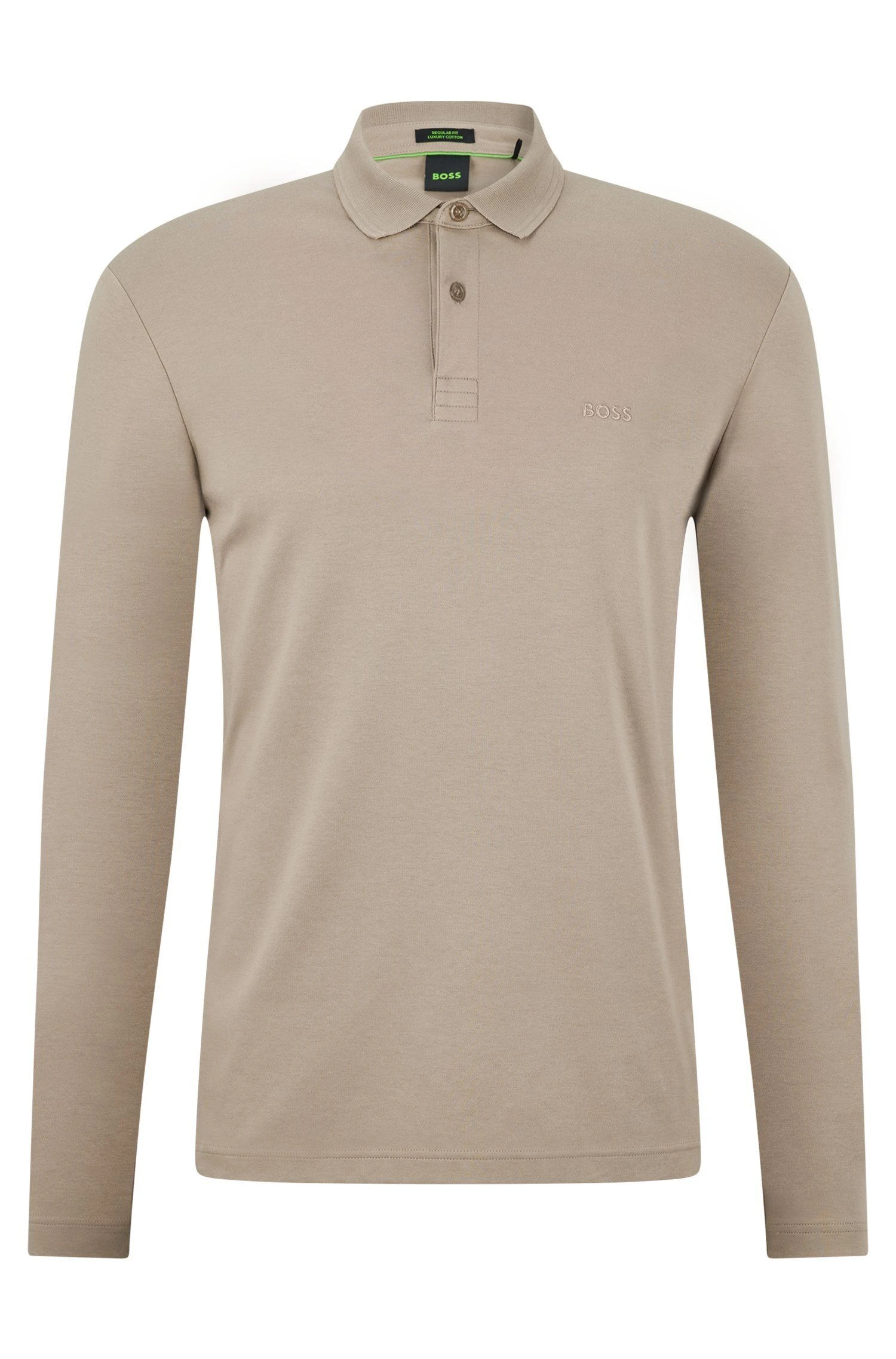 Miesten kauluksellinen trikoopaita, jossa on pitkät hihat. Paidassa on lyhyt nappilista ja helmassa pienet sivuhalkiot.