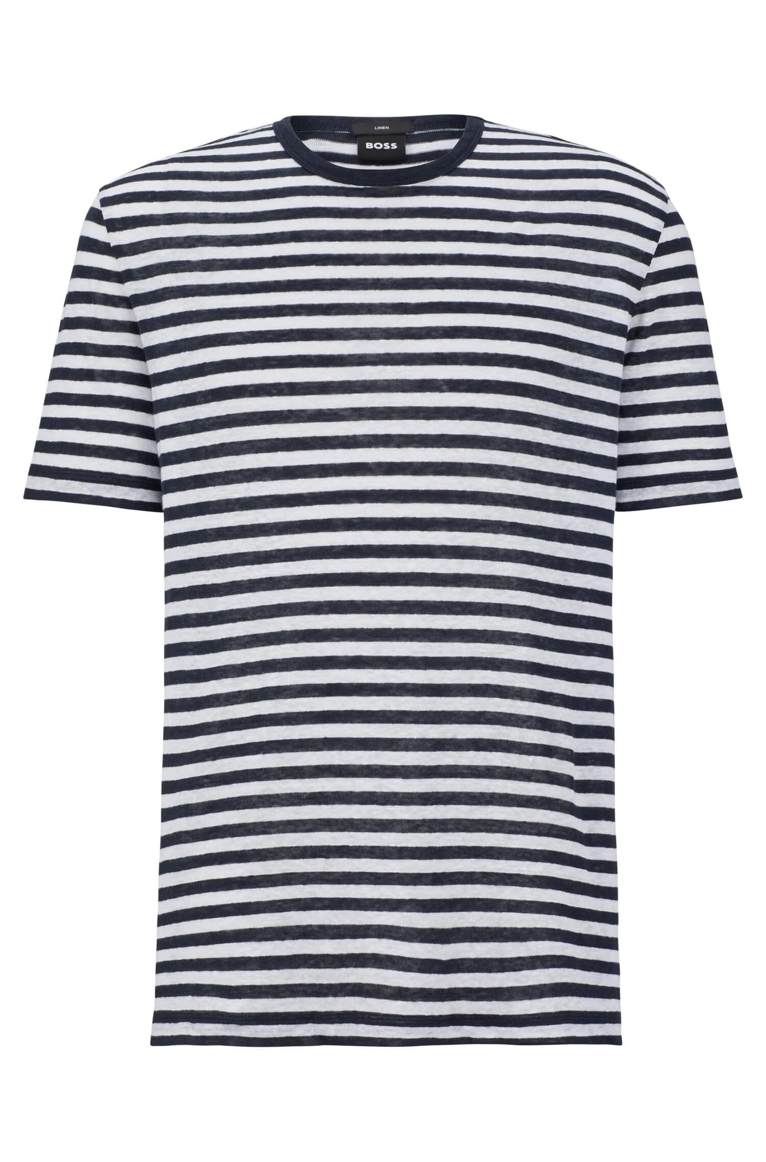 BOSS Menswearin t-paita, jossa on normaali istuvuus, vaakasuora raita ja tunnusmerkit. VASTUULLISTA tuotteissamme käytämme aina vähintään 60 % kestävämpiä raaka-aineita. Tämä vaate on valmistettu pellavasta. Pellava on luonnollinen raaka-aine. Viljely- ja louhintaprosesseja pidetään kestävämpinä, koska torjunta-aineita ja lannoitteita tarvitaan vähemmän kuin muiden raaka-aineiden viljelyssä.