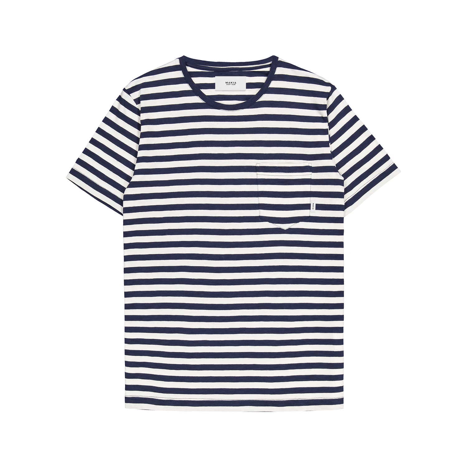 Makian miesten malliston T-paita. Klassinen raitakuosi ja rintatasku, jonka sivussa Makian logo.