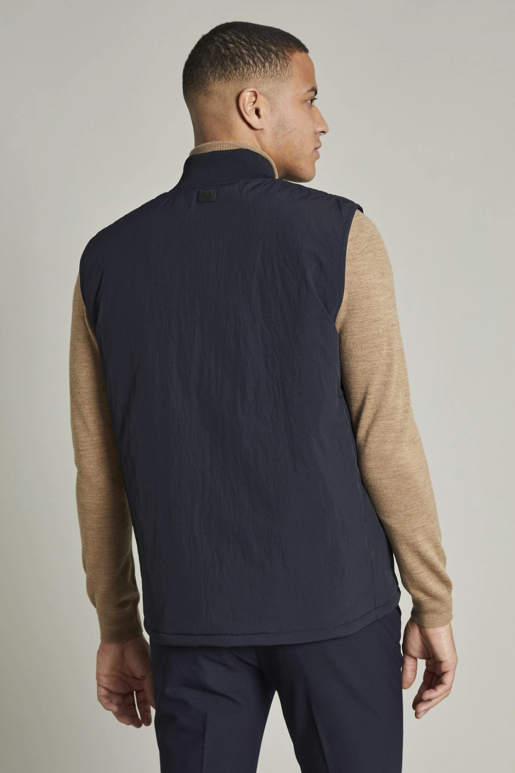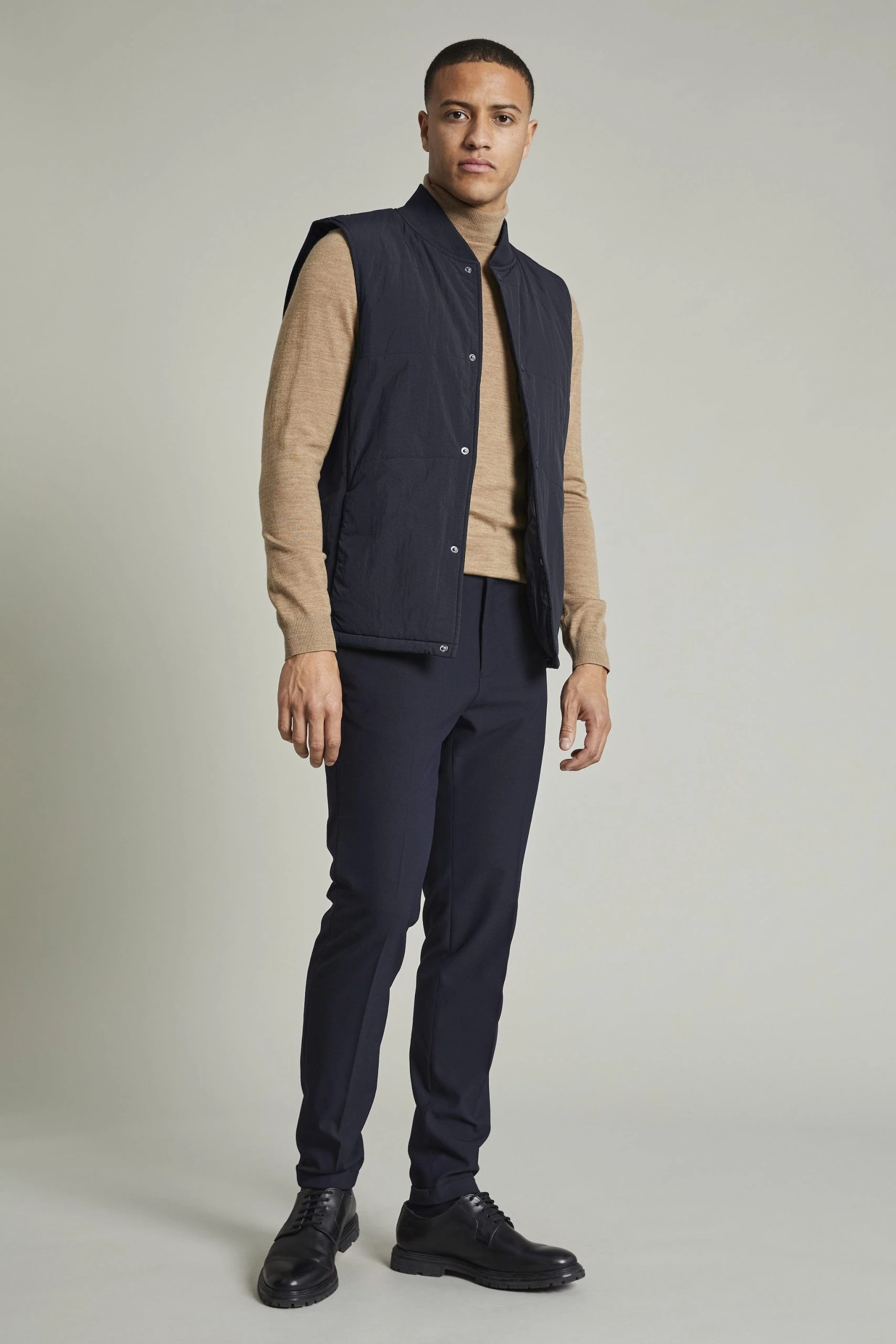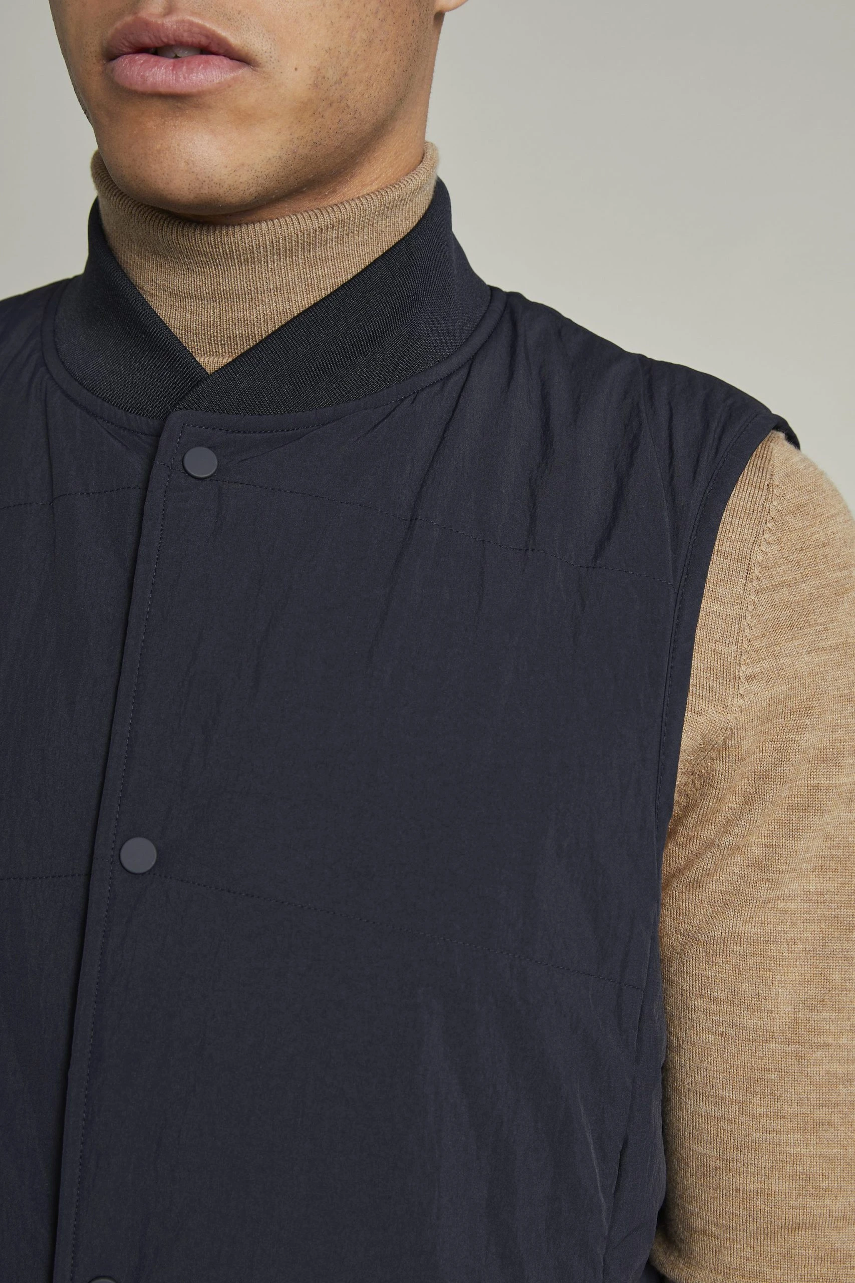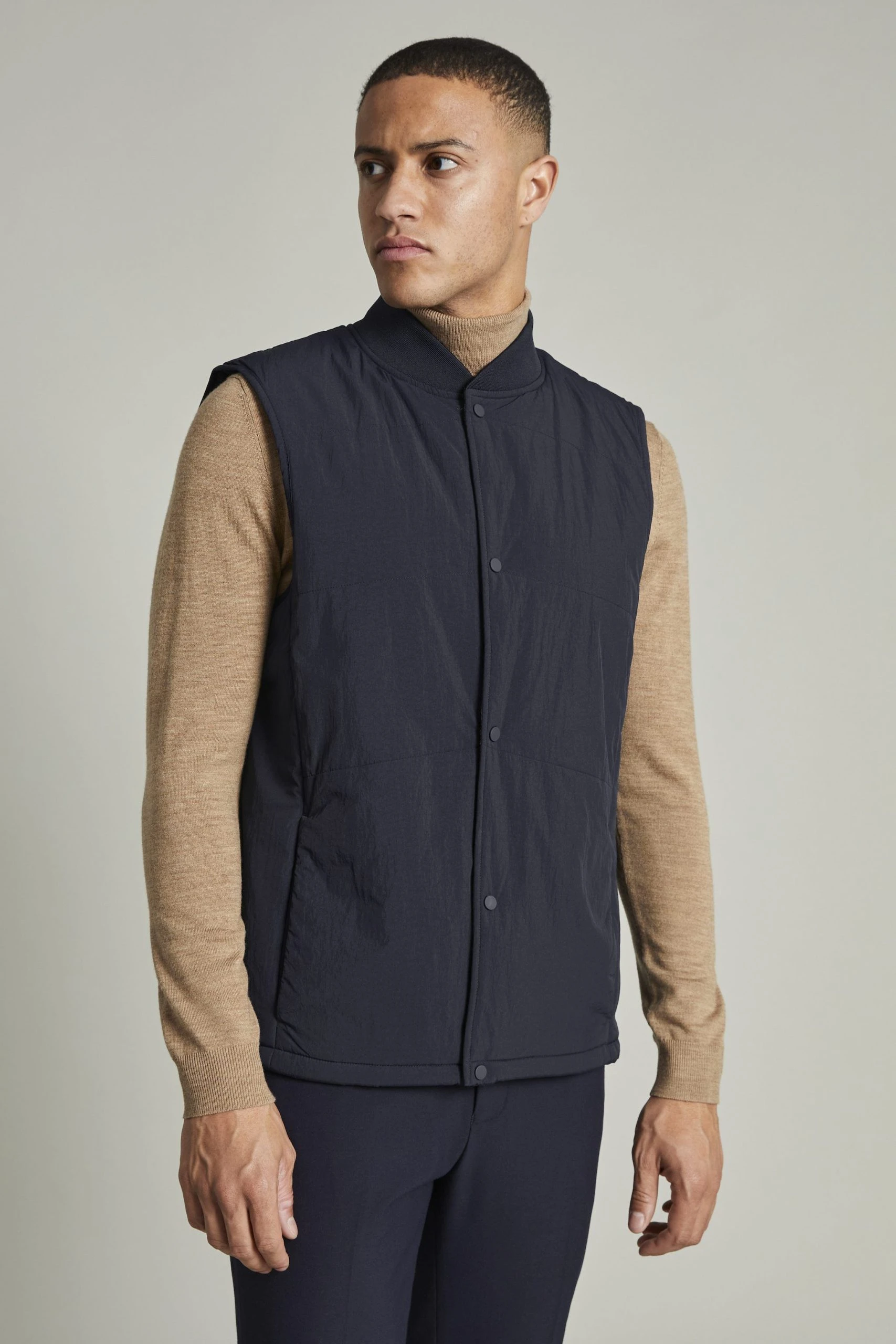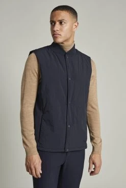 Rento pehmustettu liivi, jossa on vaakatikkauksia. Kankaan pinta on vettä hylkivää, joten liivi toimii kosteammallakin kelillä. Sivuilla taskut, edessä painonappikiinnitys. Normaali istuvuus.