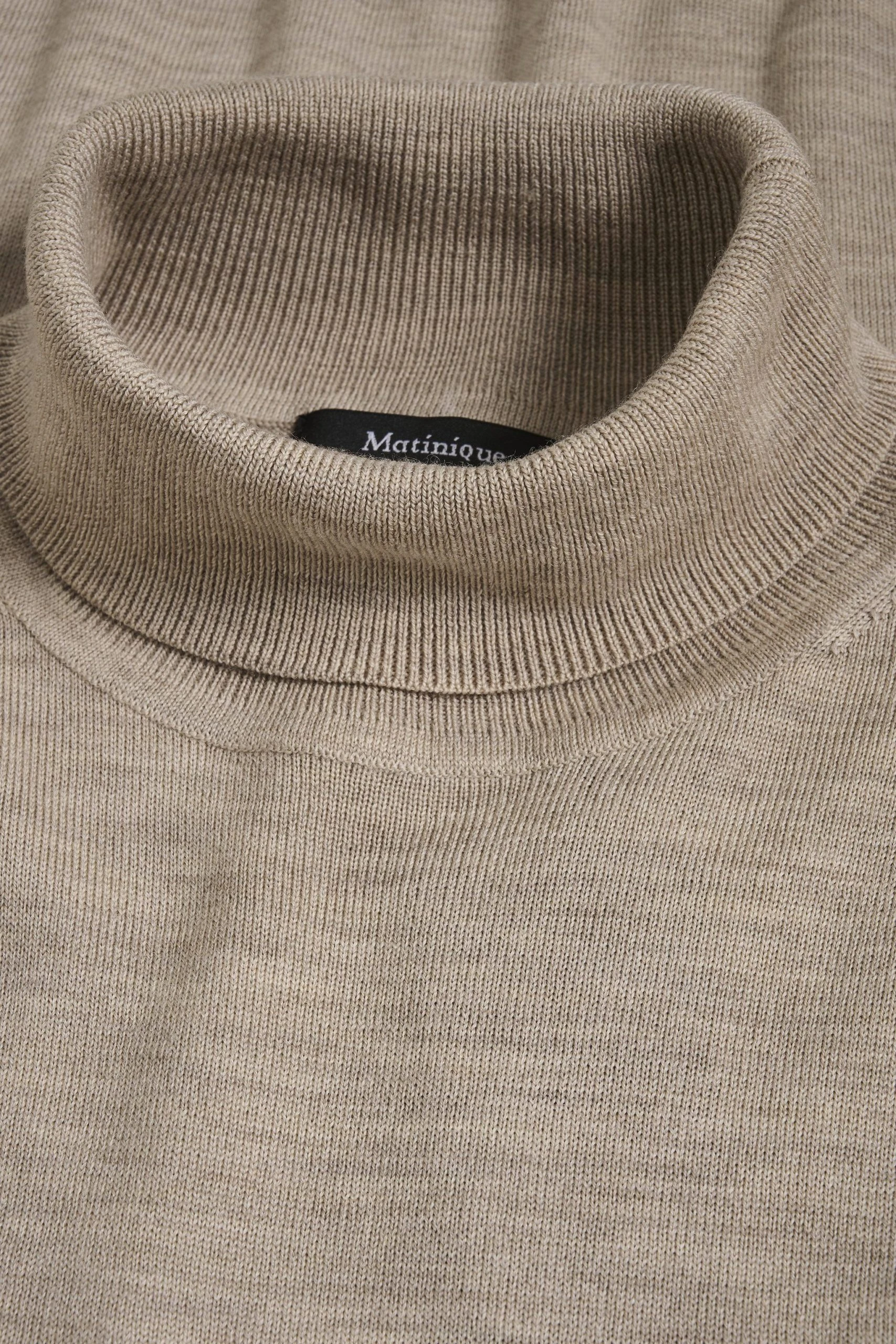 Matiniquen merinovillainen pooloneule on ylellisen pehmeä . Neuleessa on pitkät hihat ja korkea käännettävä kaulus. Merinovillaneuleelle suositellaan tuuletusta liiallisen pesun sijaan. Mitoitus on normaali.