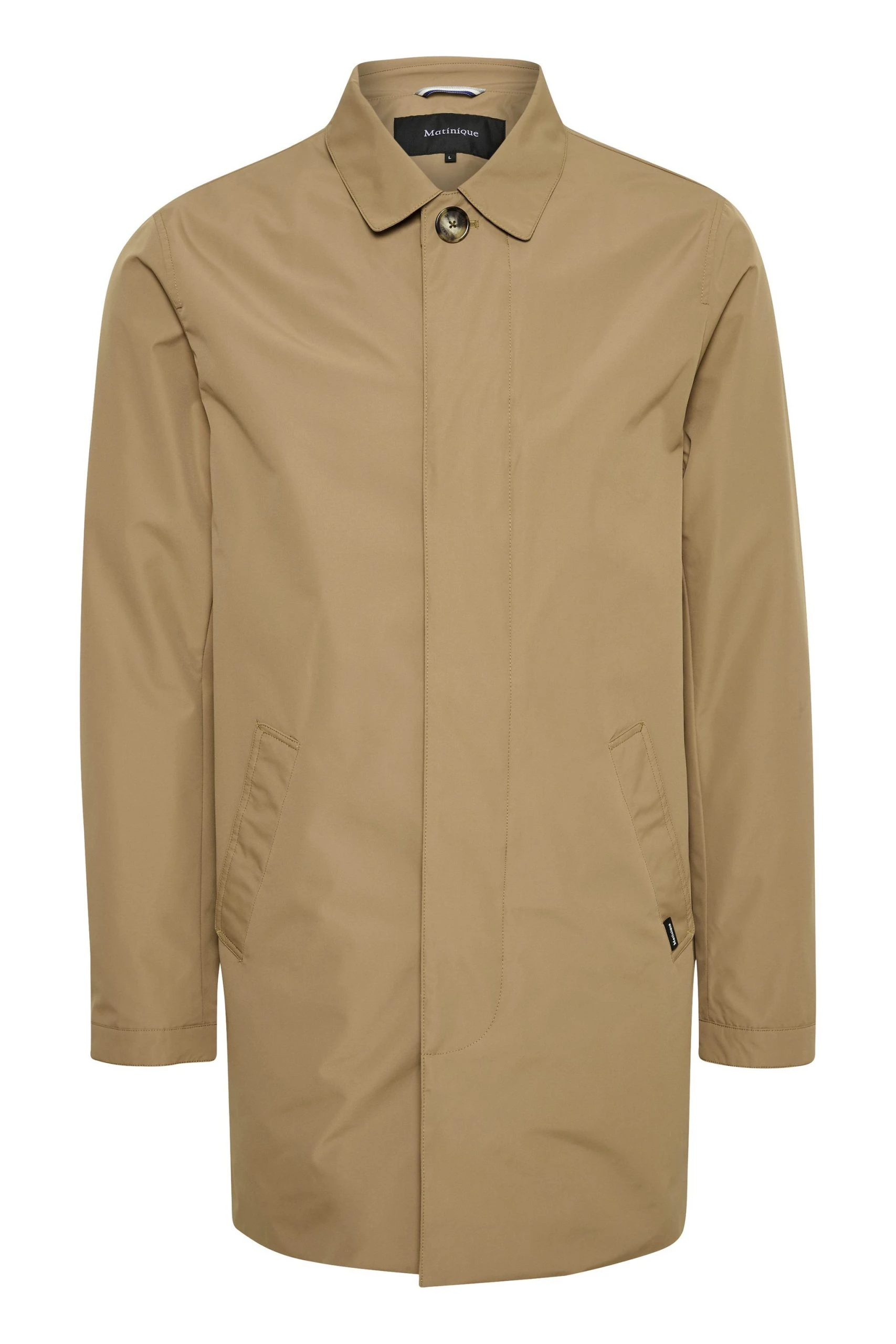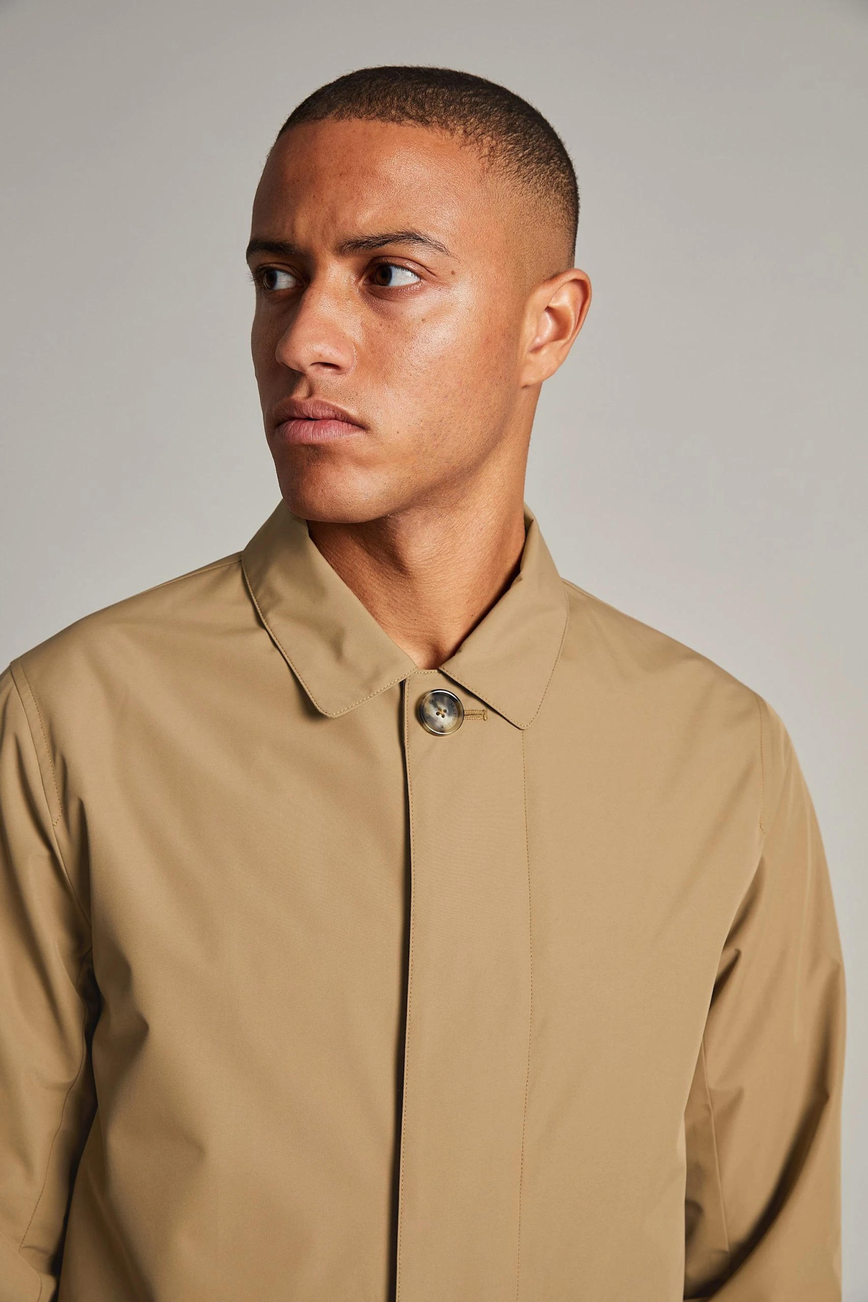 Miesten paitakauluksinen kevättakki vettähylkivää ja hengittävää osin kierrätettyä materiaalia. Edessä piilonapitus. Normaali istuvuus.