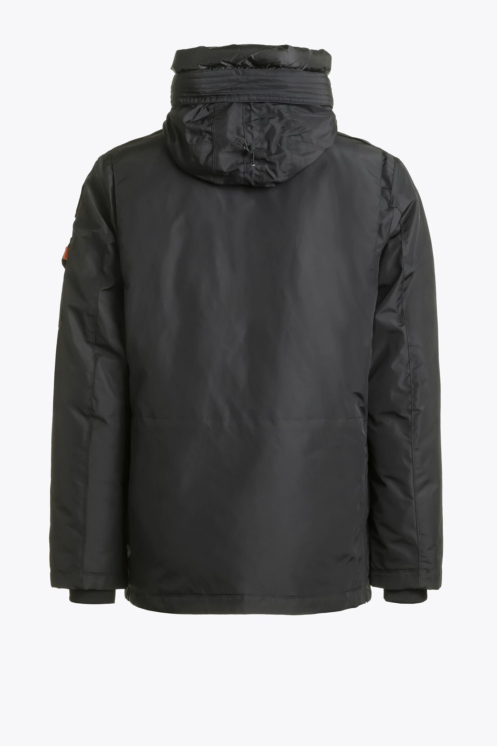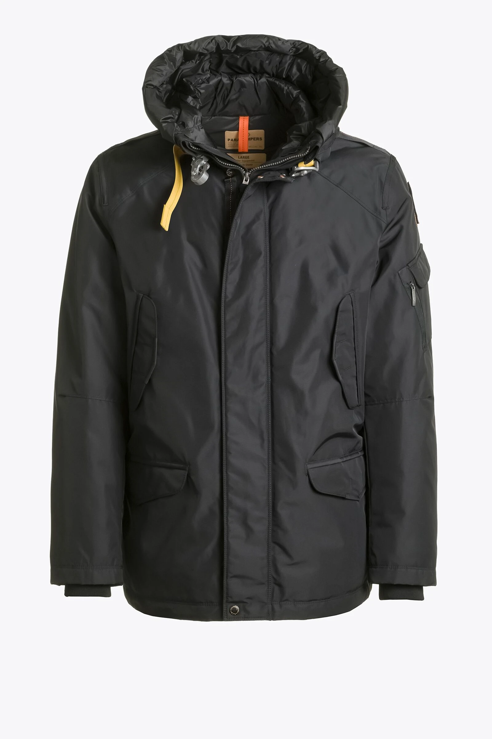 Parajumpersin untuvatäytteinen parka, joka on valmistettu laadukkaista materiaaleista ja takin pintamateriaali on vettä- ja tuulta hylkivää. Takissa on säädettävä huppu, korkea kaulus ja useita taskuja. Neljä vetoketjullista läppätaskua ja yksi vetoketjullinen hihatasku sekä neljä vetoketjullista sisätaskua. Kyynerpäissä vahvistettu pinta sekä teipatut saumat hupussa, olkapäissä ja käsivarsissa. Takin sivussa on vetoketjullinen sivuhalkio ja takin vyötäröä saa säädettyä kiristysnauhalla. Resorit hihansuissa. Kaksisuuntainen vetoketju edessä, napitettava myrskyläppä.