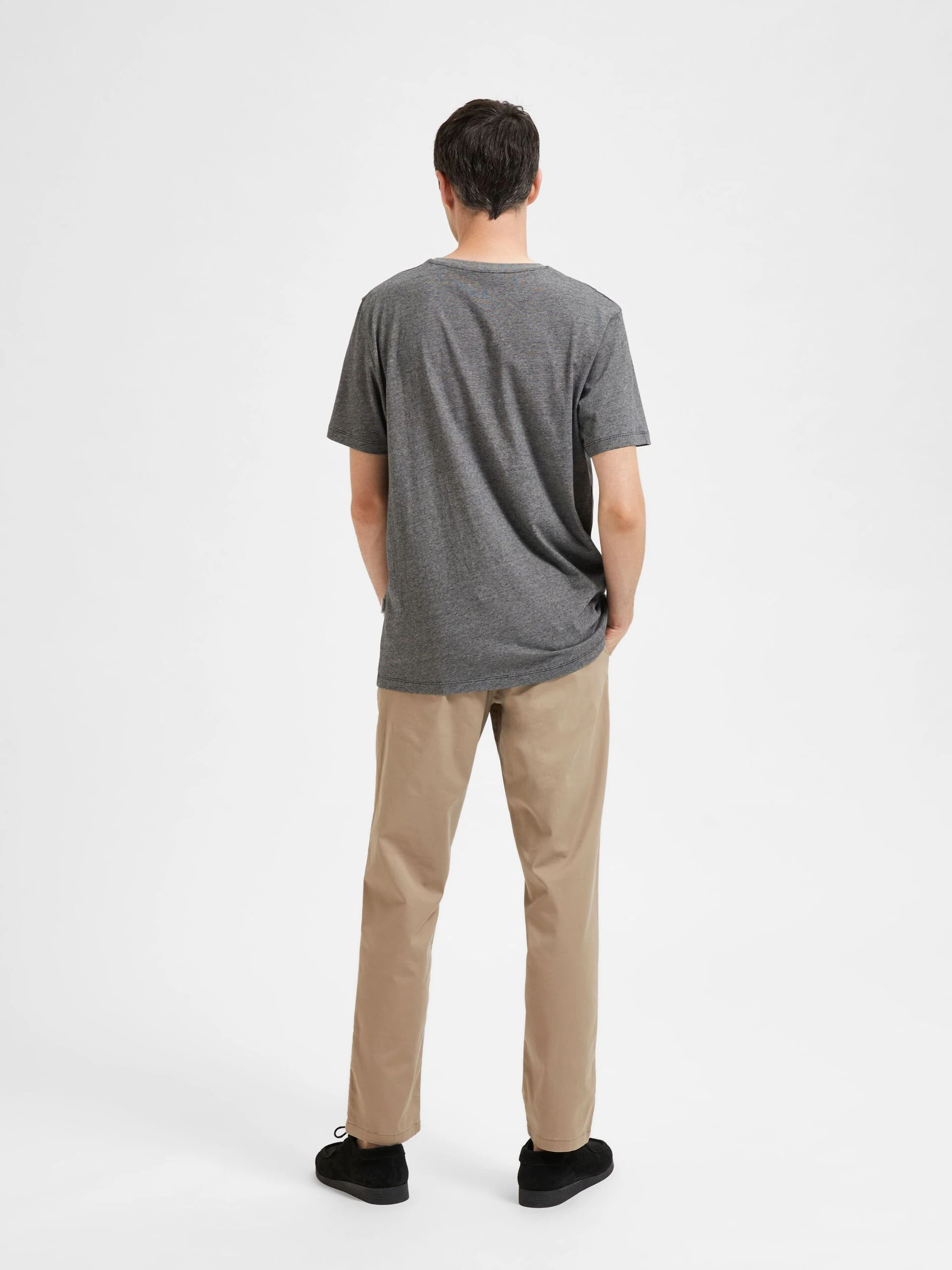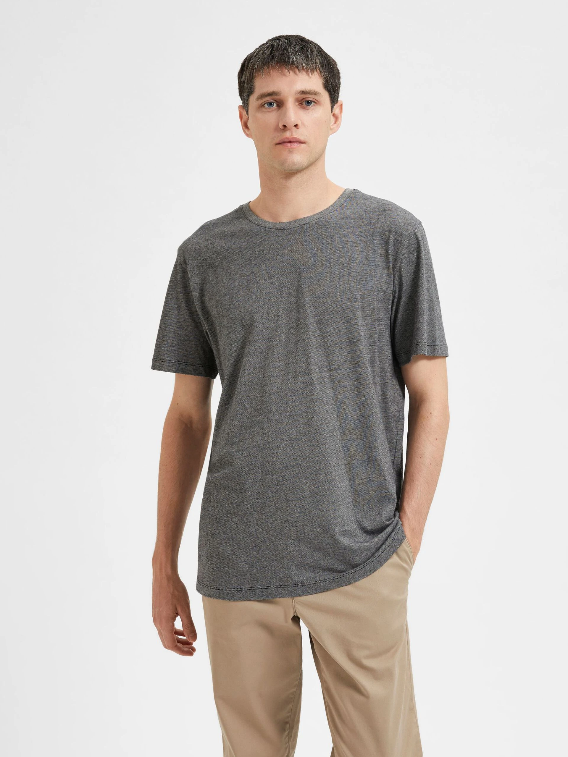 Miesten lyhythihainen t-paita. Paidassa pyöreä kaula-aukko. Paidassa pudotetut olkapäät sekä normaali istuvuus.