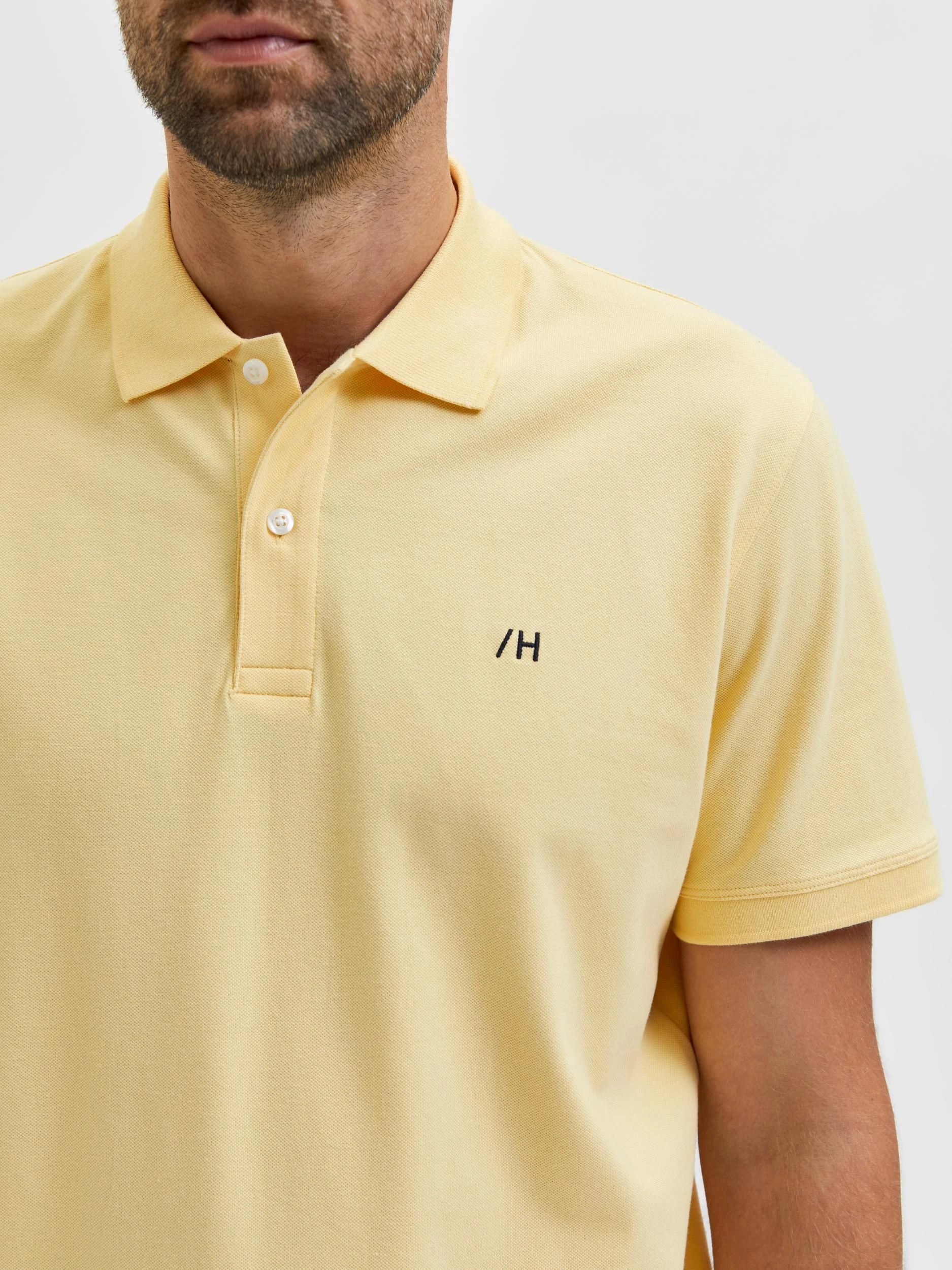 Miesten pikeepaita, edessä nappilista, pudotetut olkapäät. Brodeerattu Selected Homme -logo rinnassa. Normaali istuvuus.