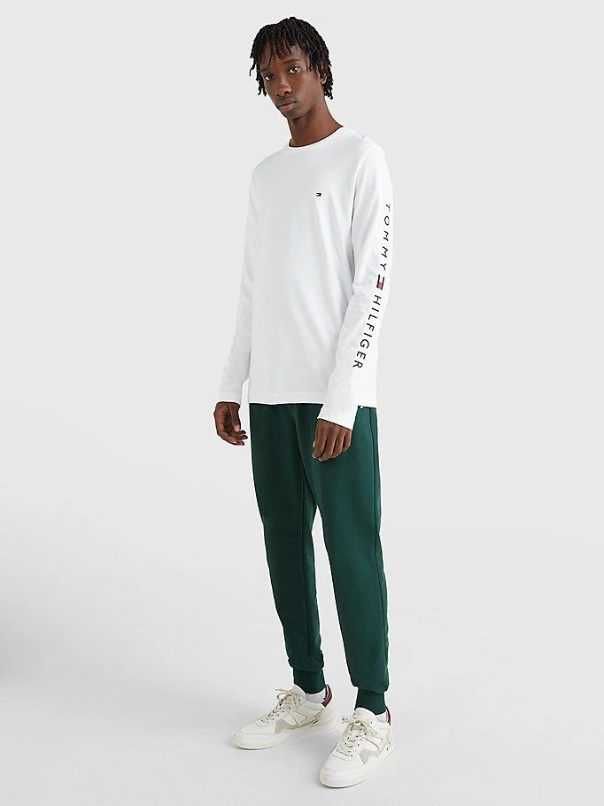 Miesten pitkähihainen t-paita, hihassa Tommy Hilfiger -logo. Pyöreä pääntie. Normaali istuvuus. Materiaali luomupuuvillaa.