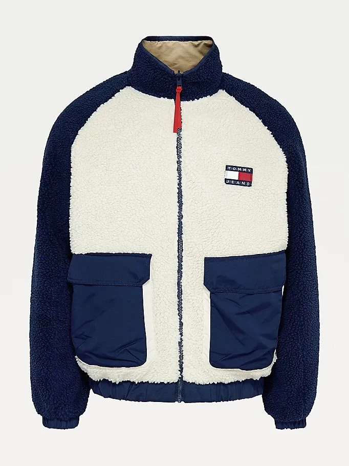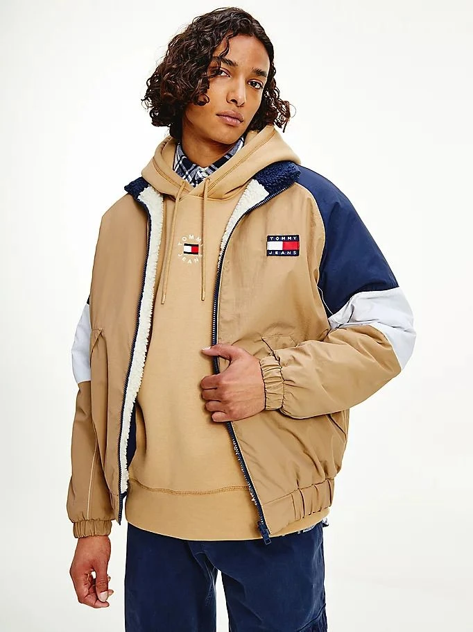Miesten kääntötakki, toinen puoli teddykangasta, toinen polyesterikangasta. Kaksi taskua vyötäröllä, joustava helma ja hihansuut. Tommy Jeans merkki rinnassa.